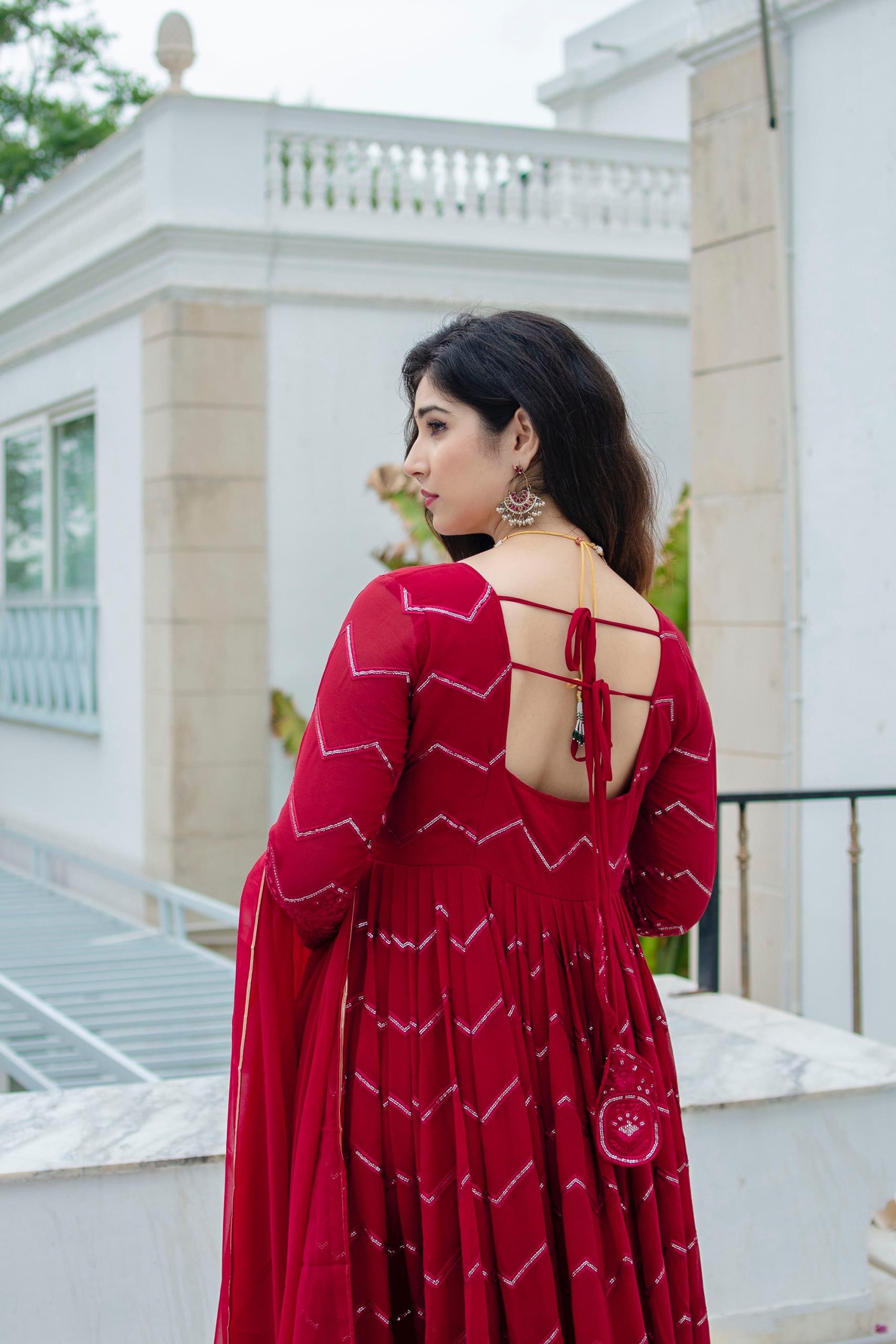 Radiate charm in this elegant crimson Anarkali suit, designed to make a statement with its deep, luxurious hue. The intricate craftsmanship on the bodice adds a delicate shimmer, enhancing the overall grace of the outfit. Ideal for weddings or festive gatherings, this outfit beautifully blends tradition with modern sophistication.