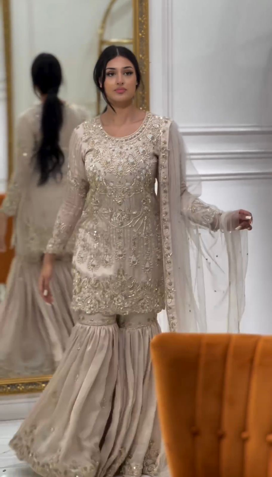 🌸 This outfit features exquisite all-over embroidery, highlighting intricate craftsmanship. The long, beautifully detailed kameez pairs perfectly with the flowing sharara pants, creating a regal and graceful silhouette.