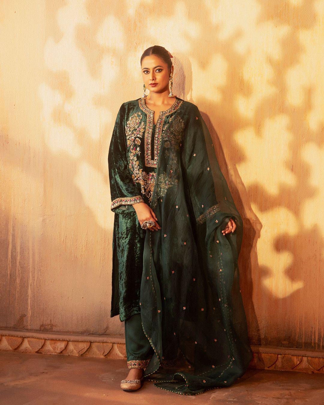 Exude grace and sophistication in this luxurious green velvet kurta adorned with intricate golden and pink floral embroidery. This premium ensemble features a delicately embellished neckline and borders, paired with tailored trousers and a sheer dupatta enhanced with subtle embellishments. Perfect for weddings, festive events, or special occasions, this outfit combines traditional craftsmanship with timeless elegance.