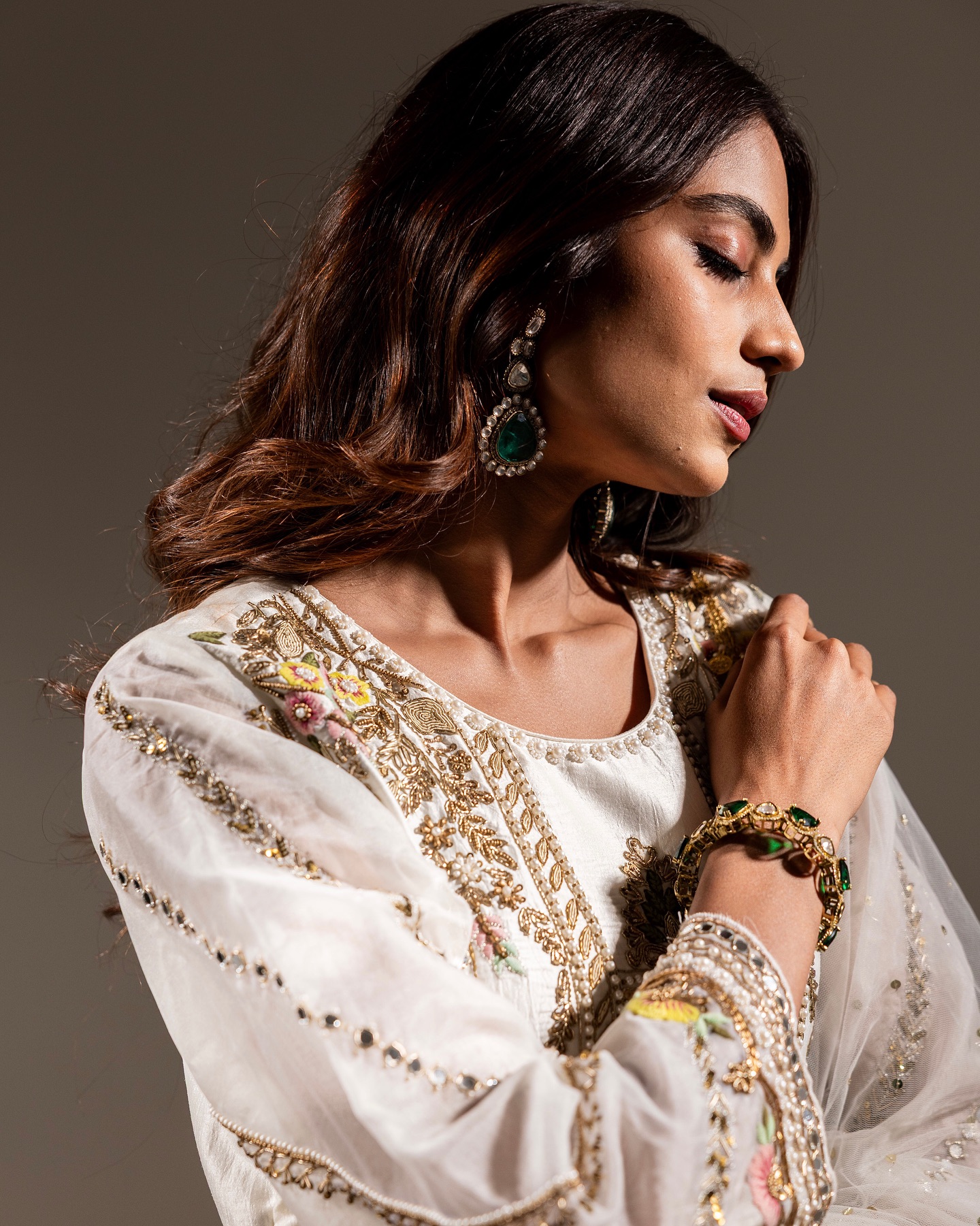 Kurta: Features intricate floral, palm tree, and bird embroidery in pastel threads. Detailed with sequins, pearls, and a scalloped hemline featuring mirror work and multi-colored tassels.