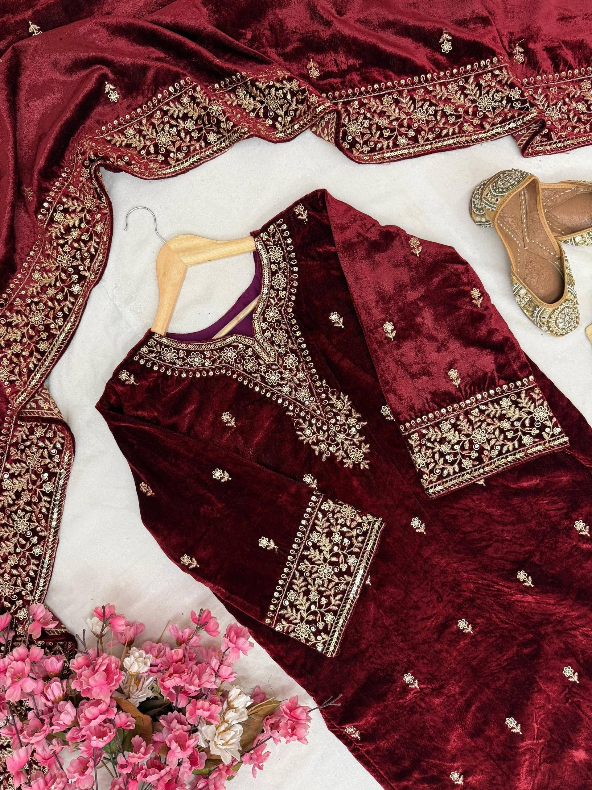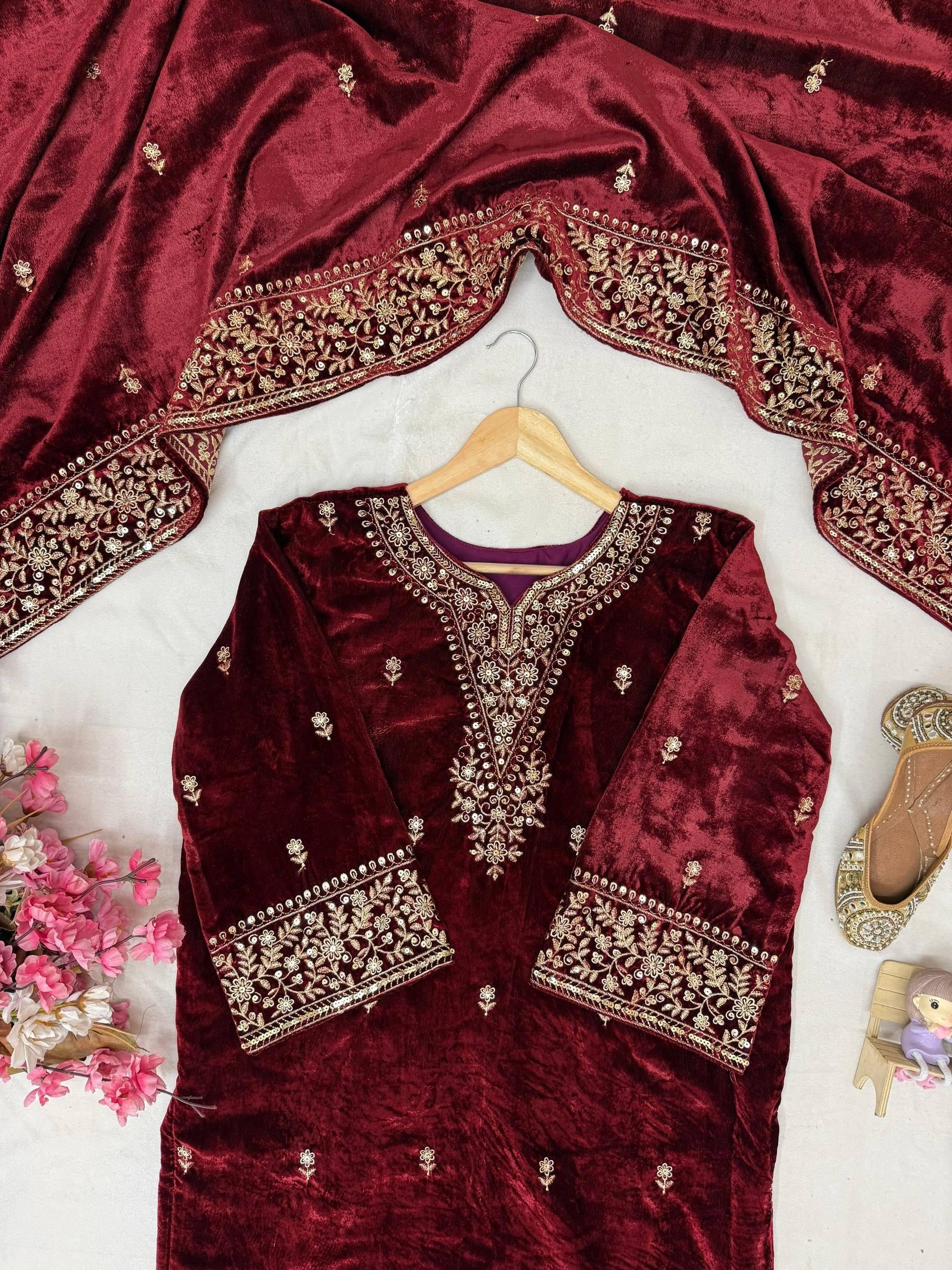 Luxnetics Designer Embroidery Work Velvet Kurti Pant Dupatta Set (Ready to Wear)