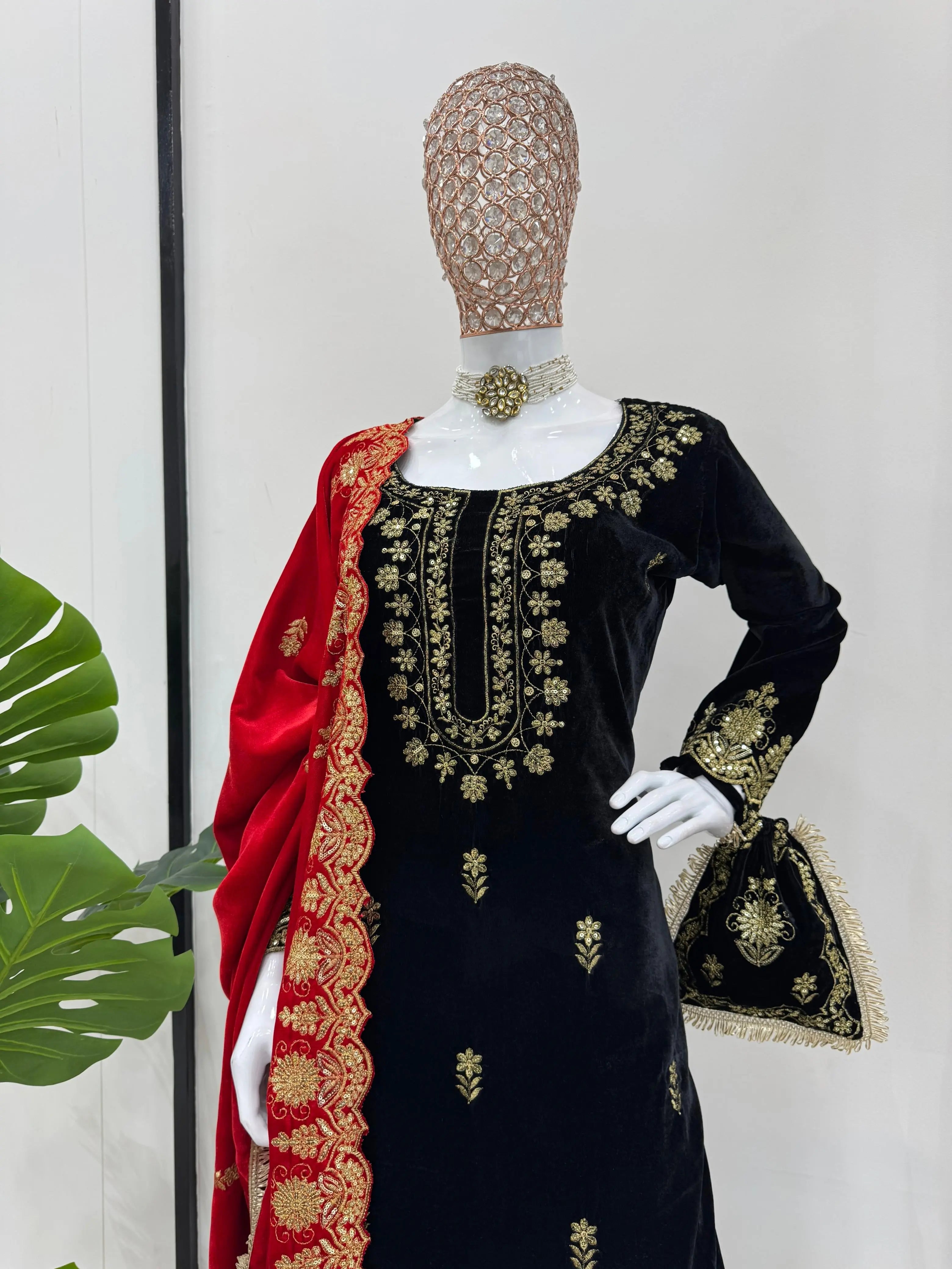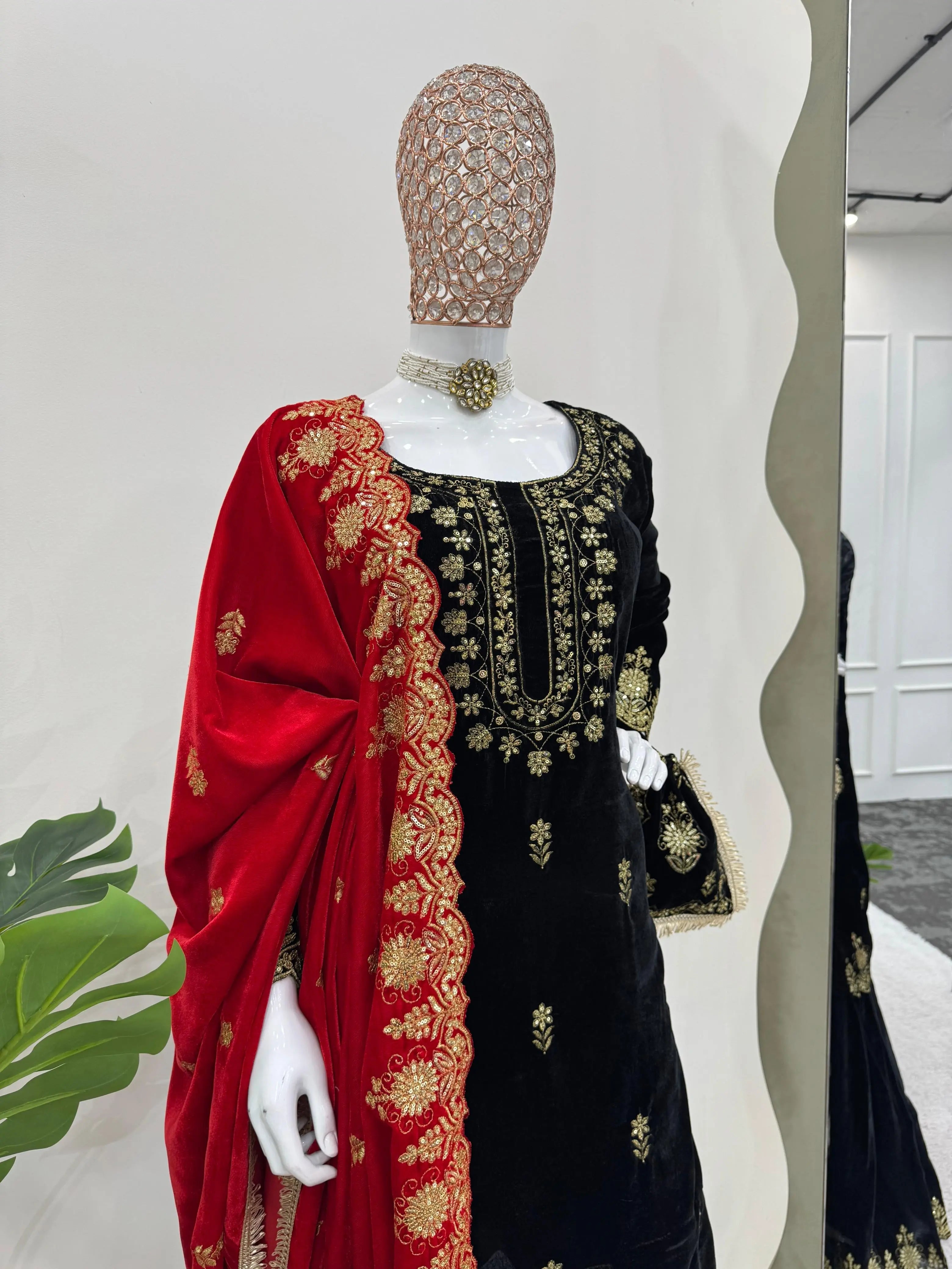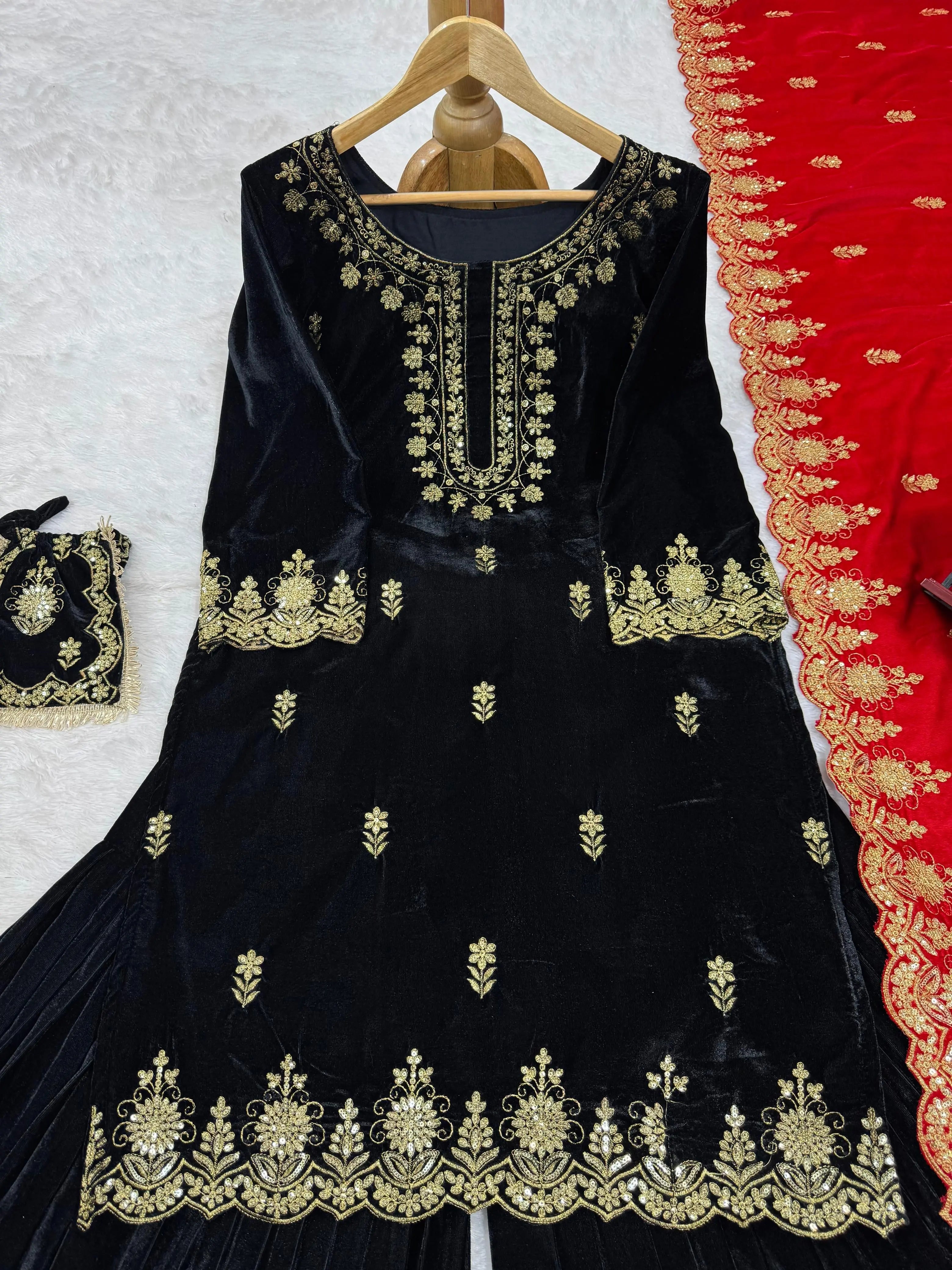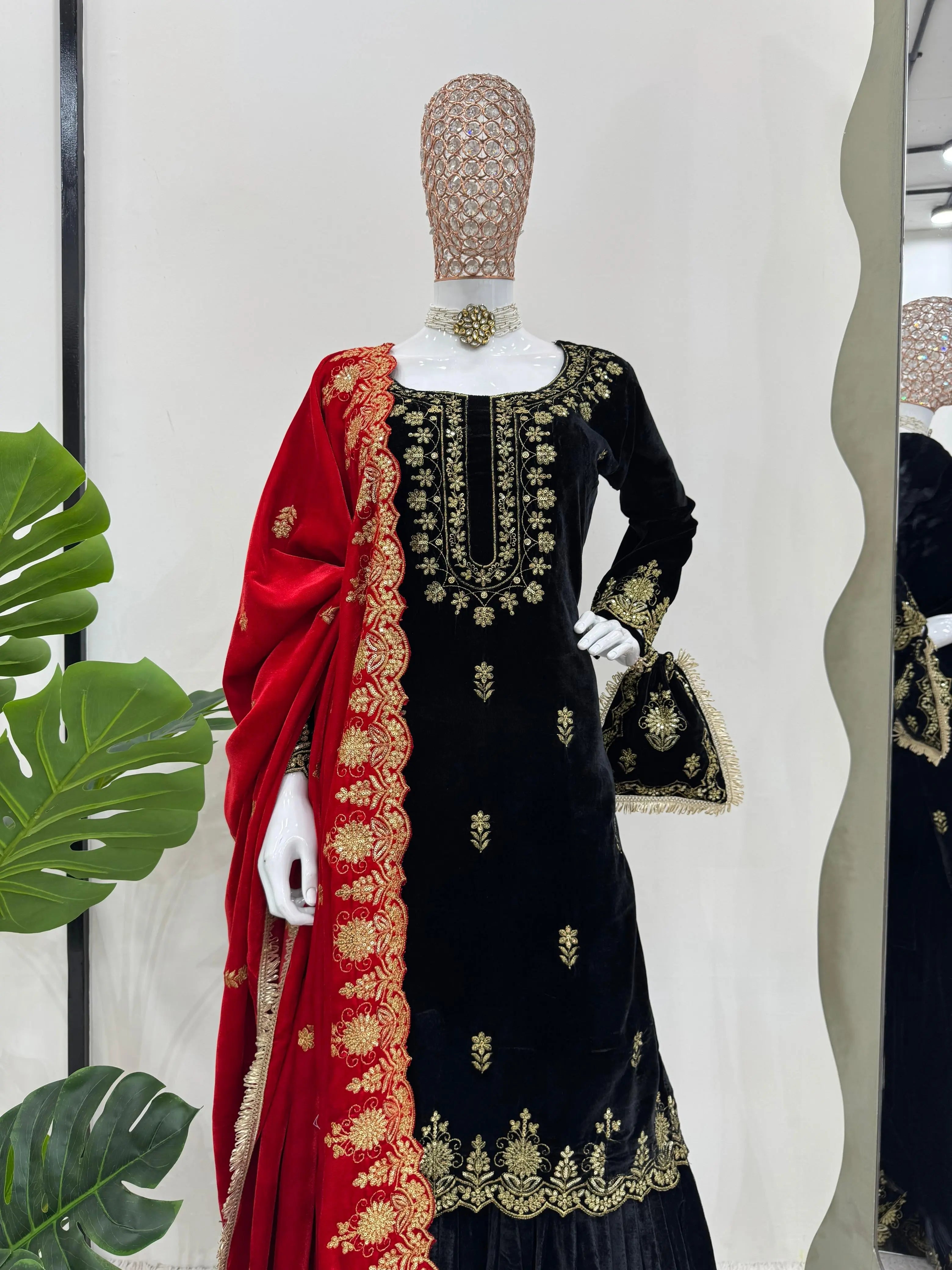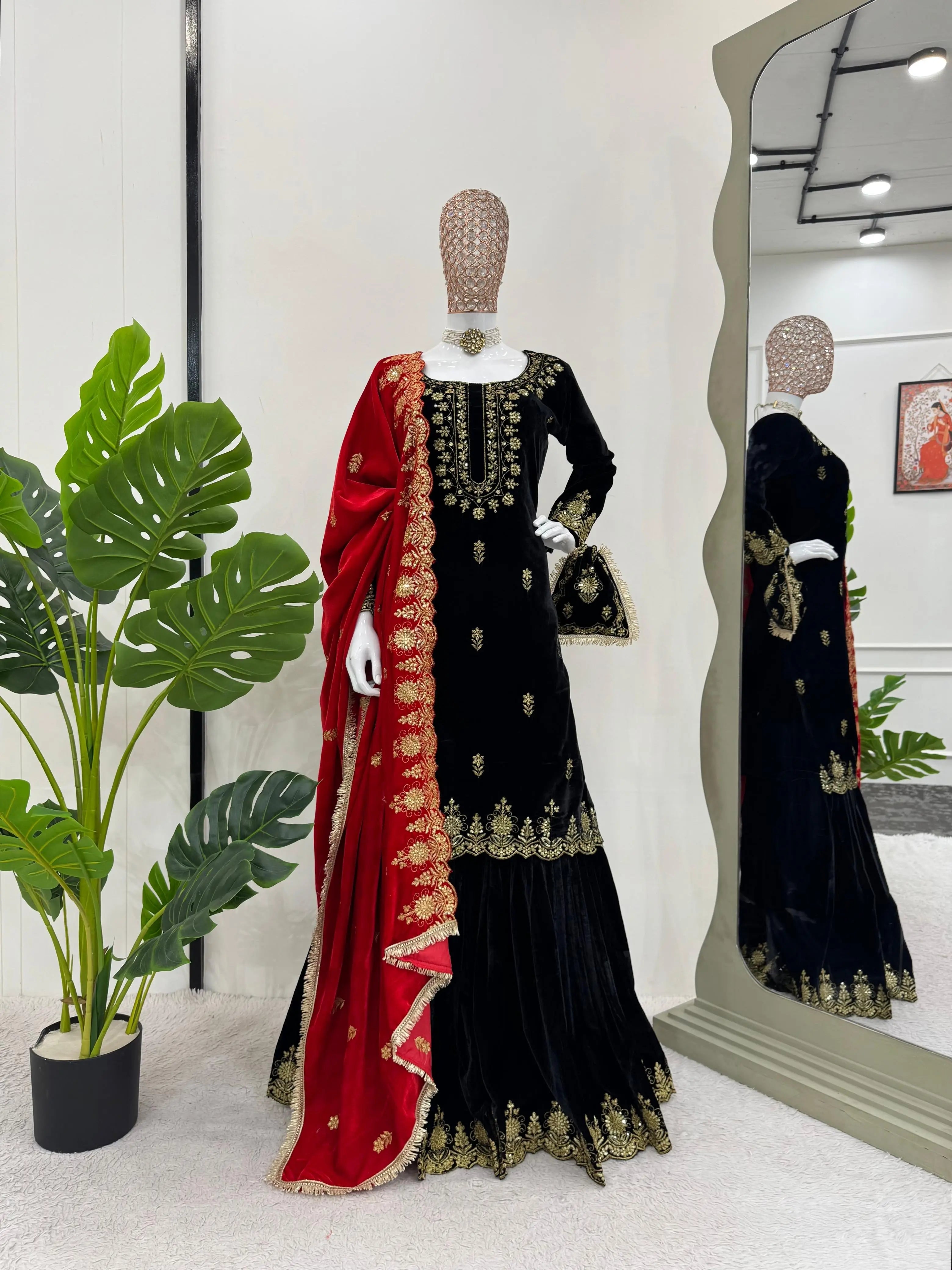 Luxnetics Fine Velvet Golden Thread Embroidery work Velvet Kurti Sharara