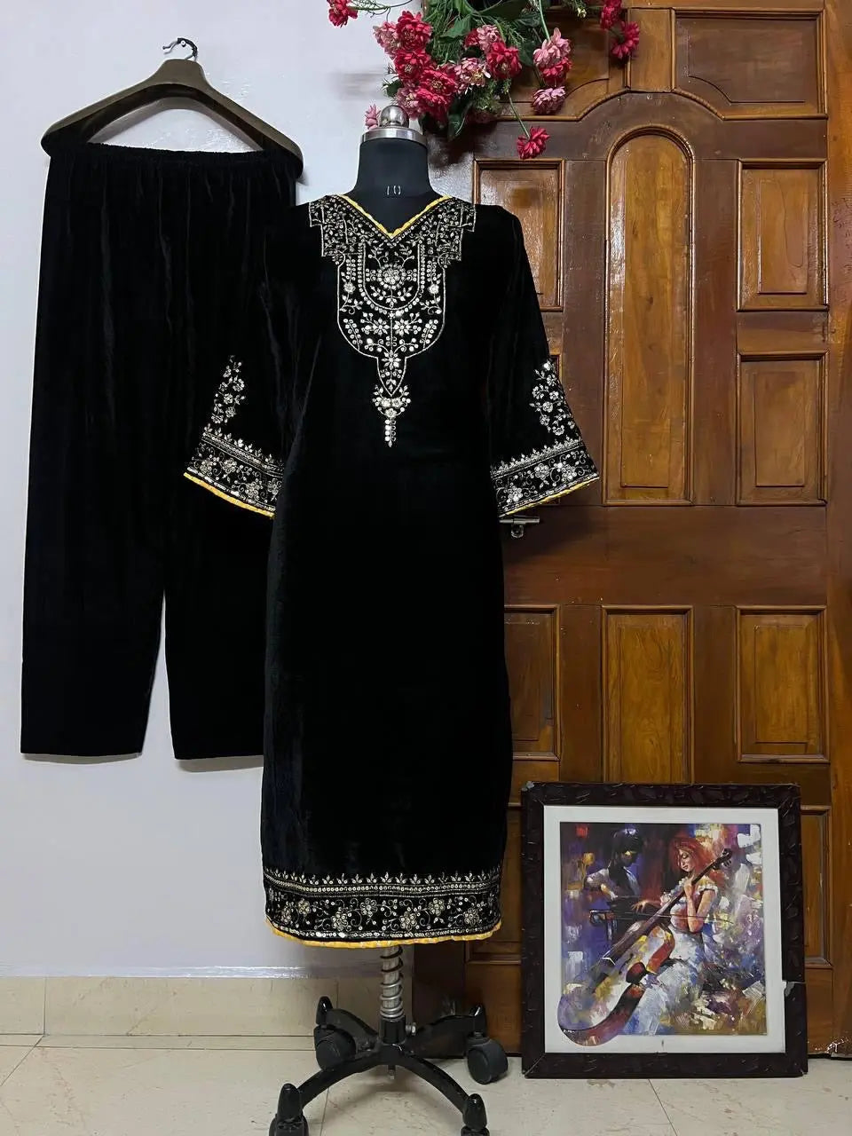 Luxnetics Sequence Embroidery Work Velvet Kurti Pant Set