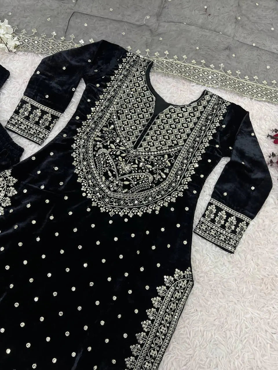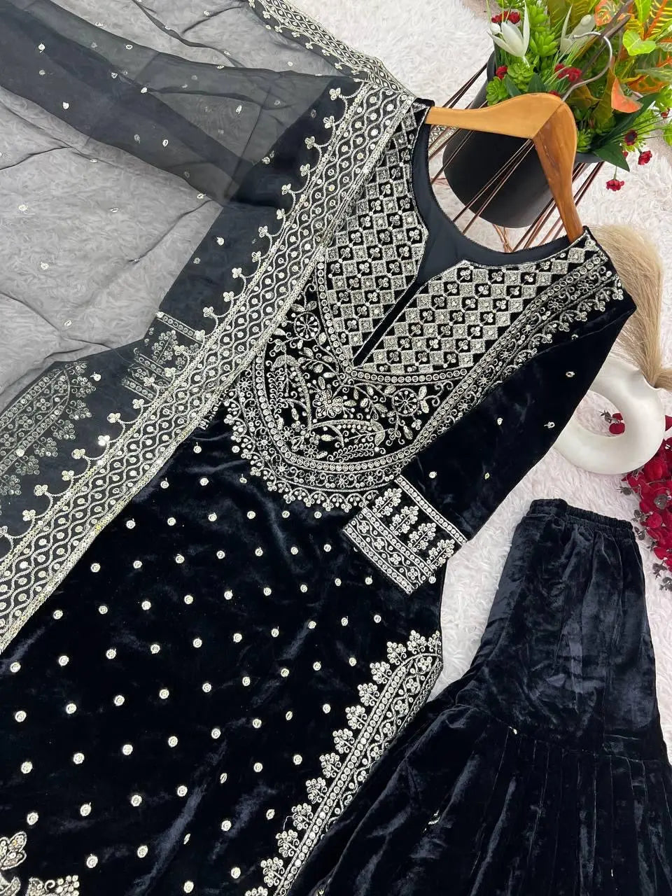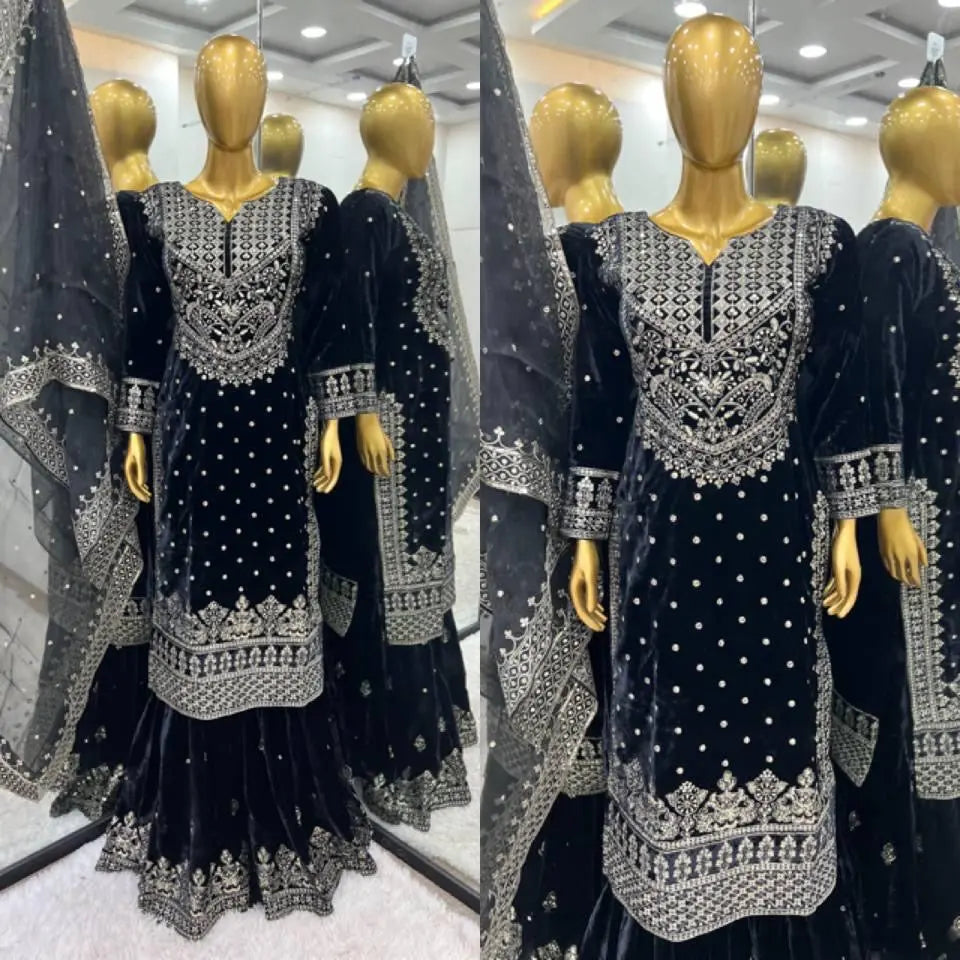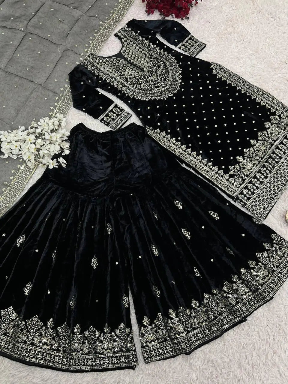Luxnetics Silver Thread Embroidery work Reasdy to wear Velvet Kurti Sharar Set