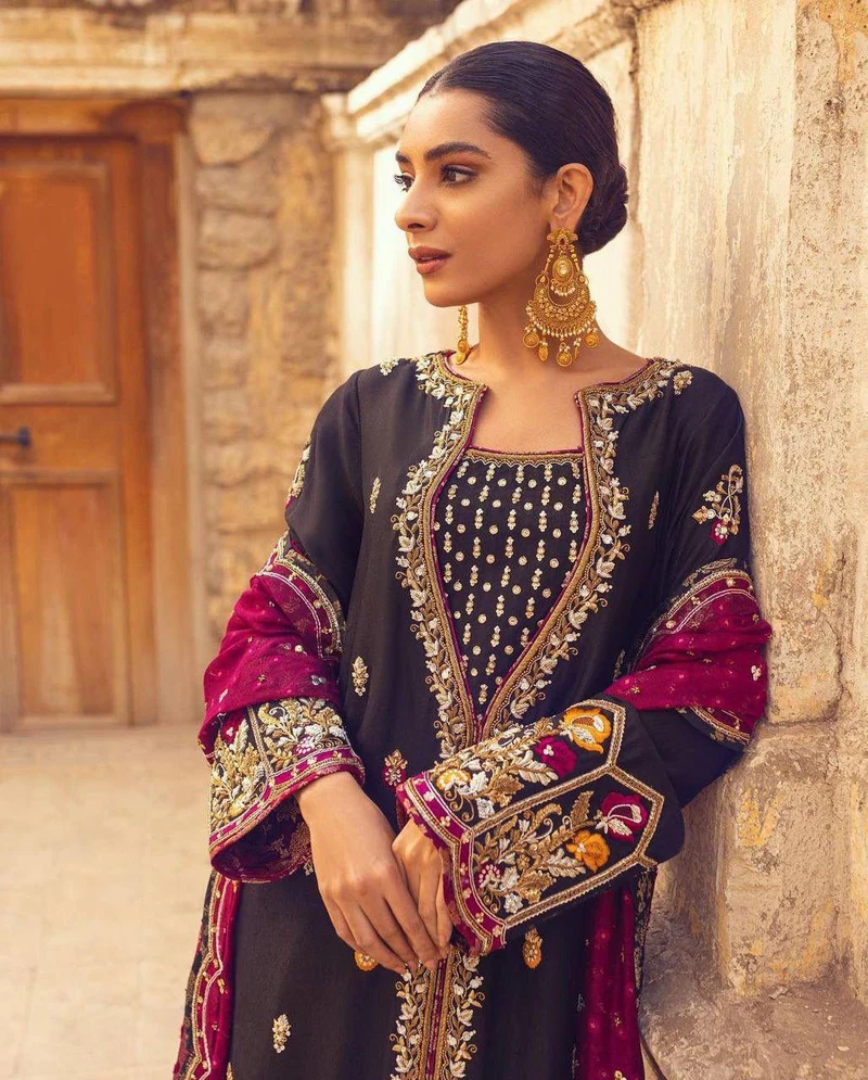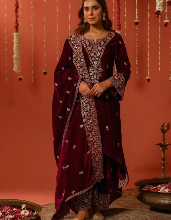 The Details At the heart of this set is the luxurious heavy velvet fabric, chosen for its smooth texture and rich sheen. The top (kurta) is fully stitched and features elaborate sequence embroidery that catches the light beautifully, with special attention given to the ornate neckline and contrasting embroidered cuffs.