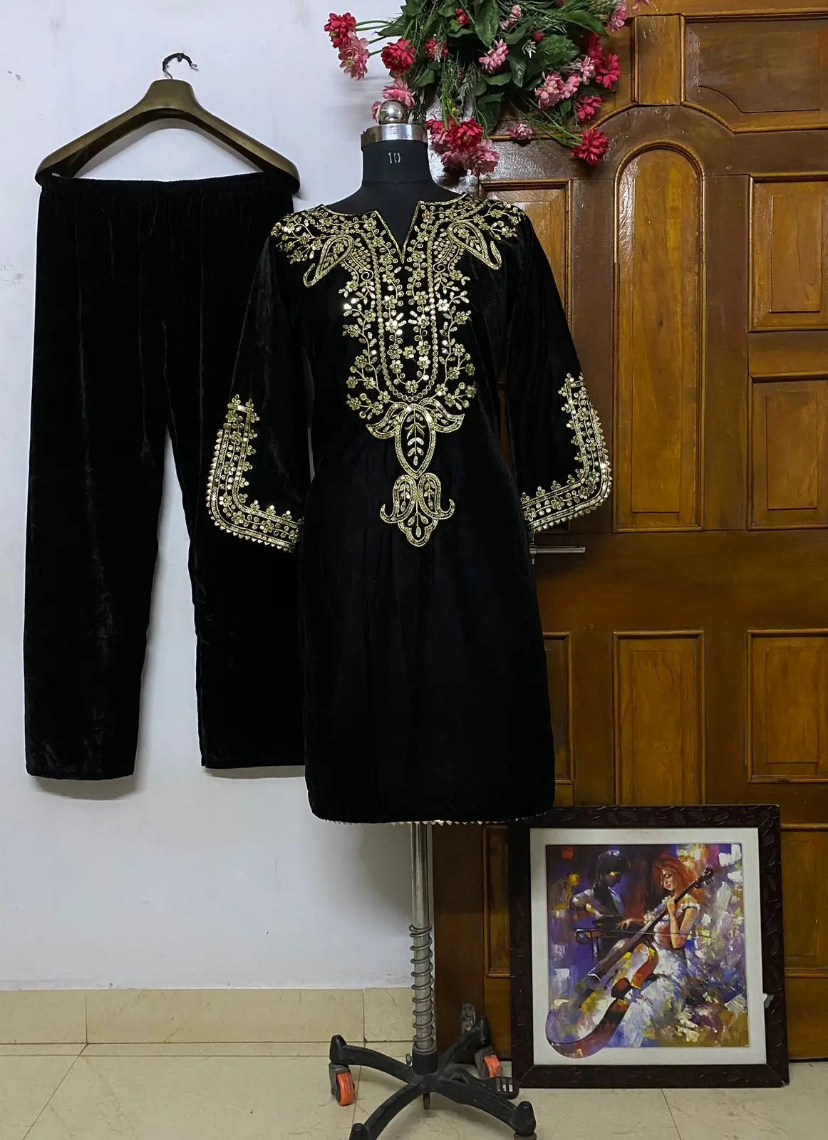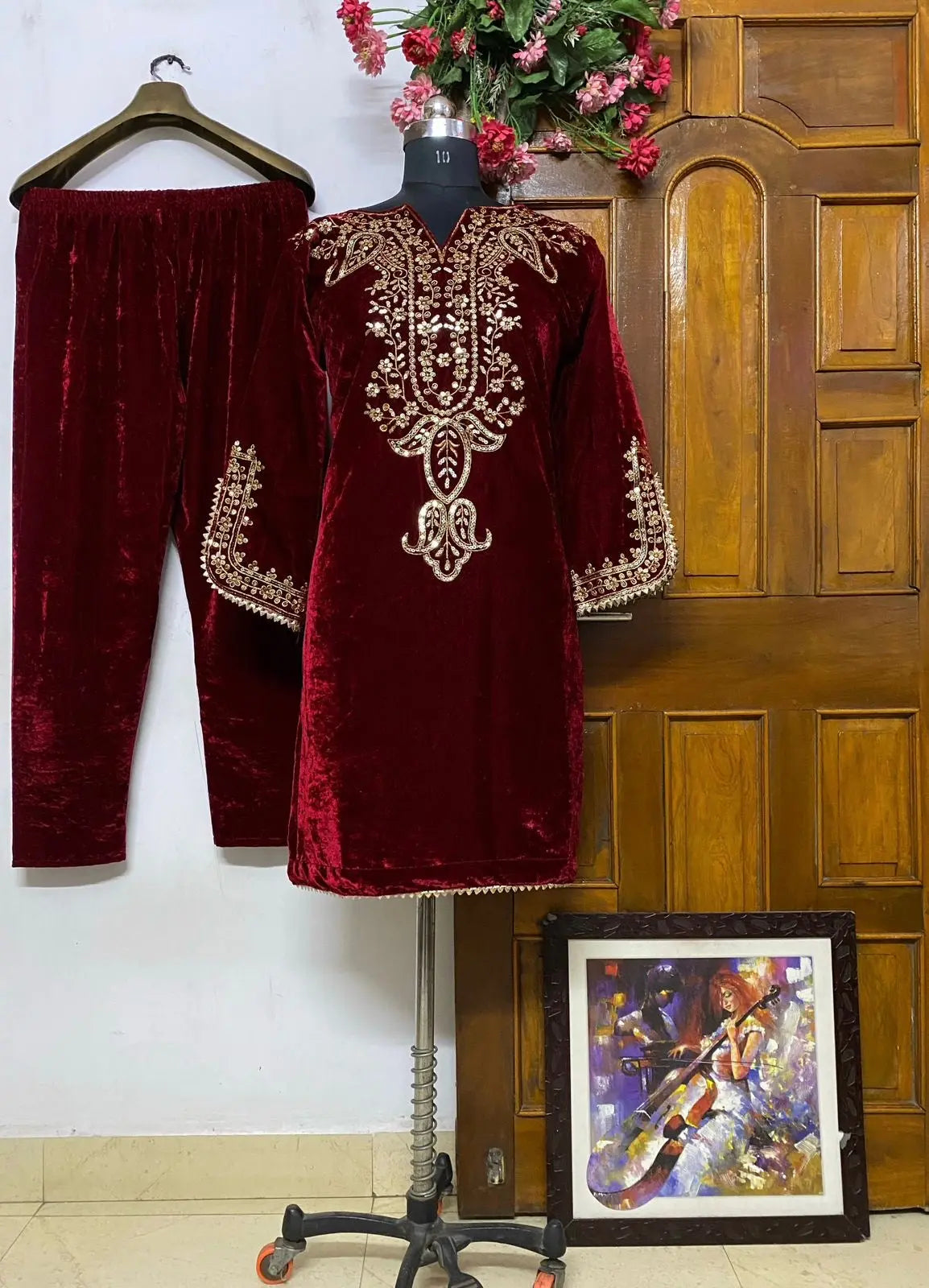 Neck Embroidery work Velvet Kurti Pant Set (Stitched)