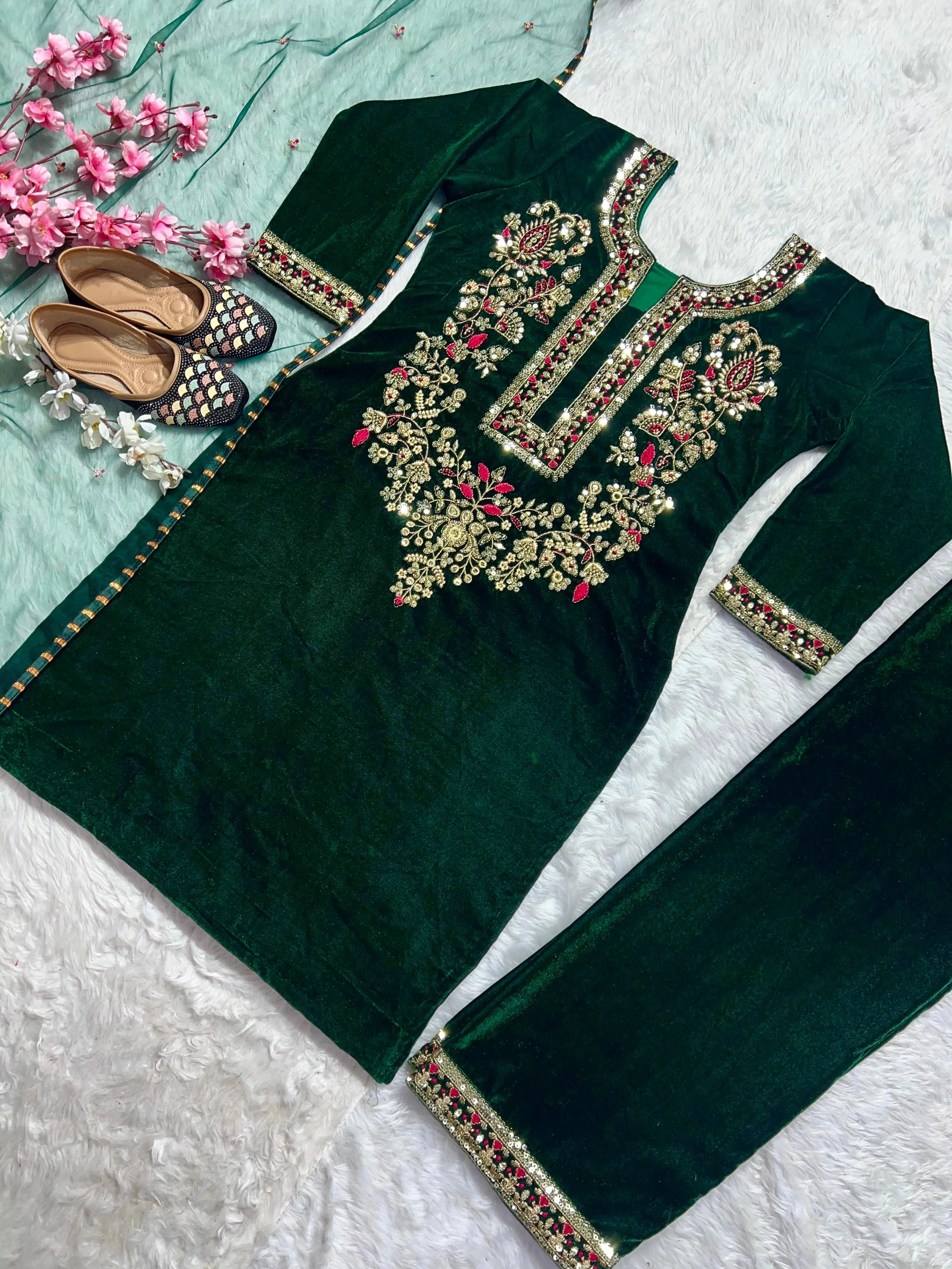 Neck Embroidery Work Winter Wear Velvet Kurti Pant Dupatta Set