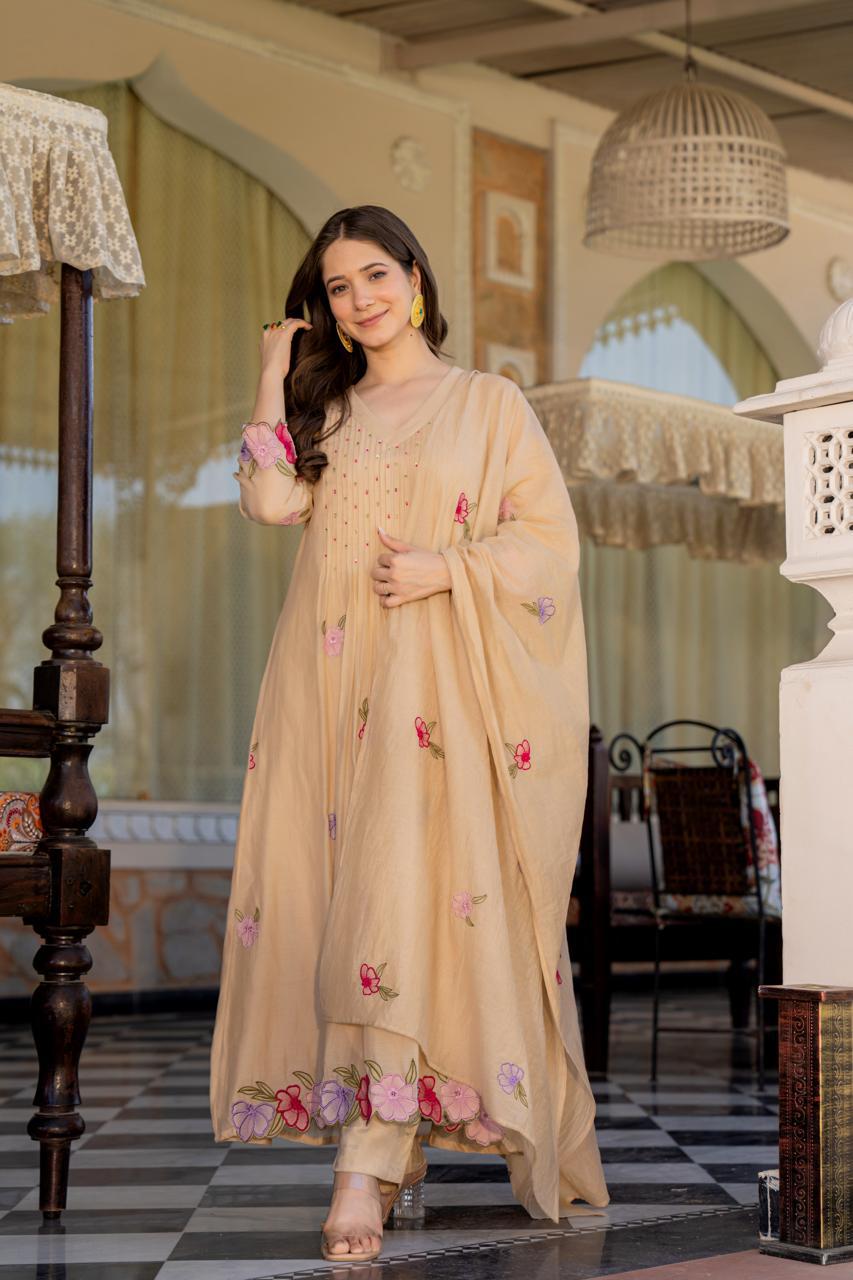 Upgrade your ethnic wardrobe with this elegant Kurti Pant and Dupatta Set, thoughtfully crafted in premium Mul Chanderi fabric that offers a perfect balance of softness, light sheen, and breathability. Known for its graceful texture and luxurious feel, Mul Chanderi adds a refined charm to the overall look, making this set ideal for both festive and semi-formal occasions.