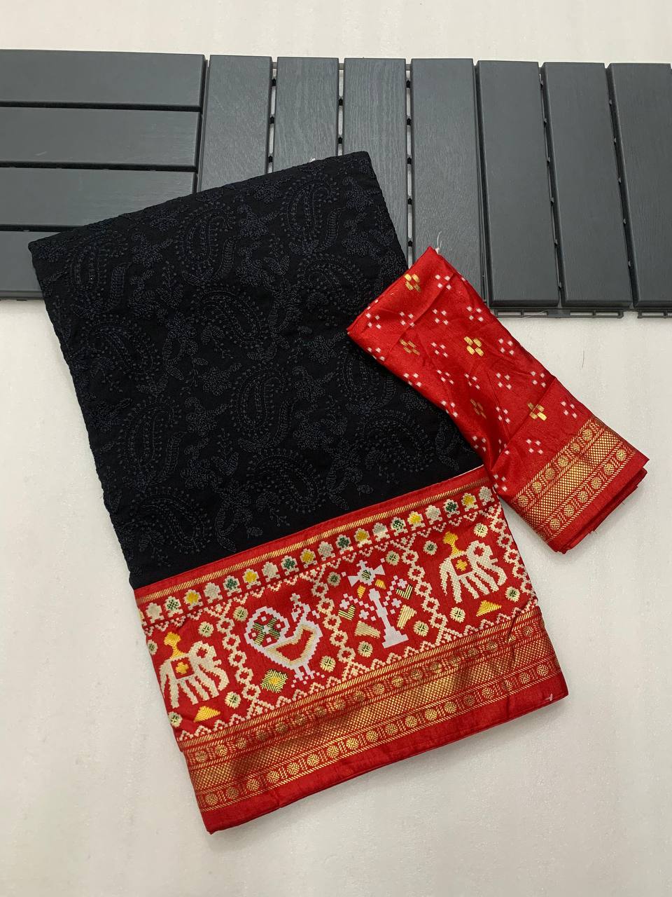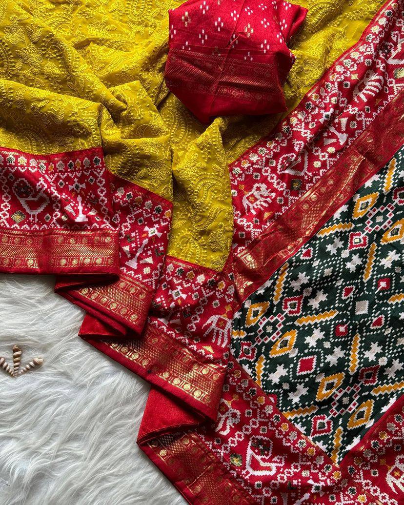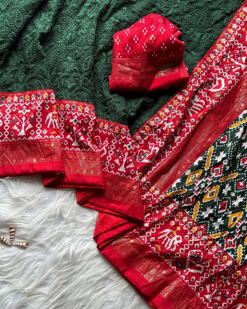 With fusion of *Rich Patola foil printed border and pallu with handwoven exclusive ball tassels*🧶