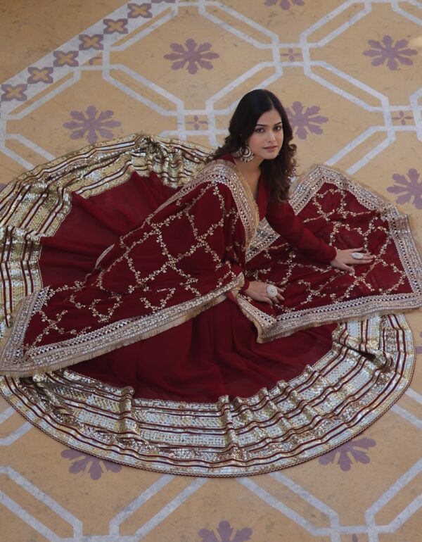 The Regal Sindoor Red Heritage Lehenga Choli is a masterpiece that beautifully blends traditional craftsmanship with timeless elegance. The intricate embroidery and rich fabric reflect unmatched quality, making it a perfect choice for special occasions.