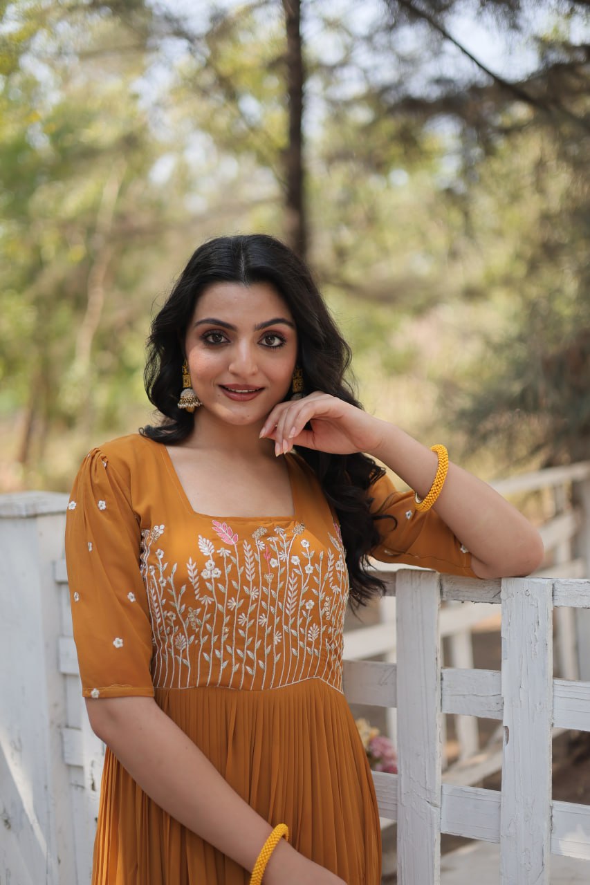 Bahut sundar gown hai, bilkul royal feel deta hai. Fabric mast hai aur look toh amazing hai, bilkul paisa vasool purchase!
