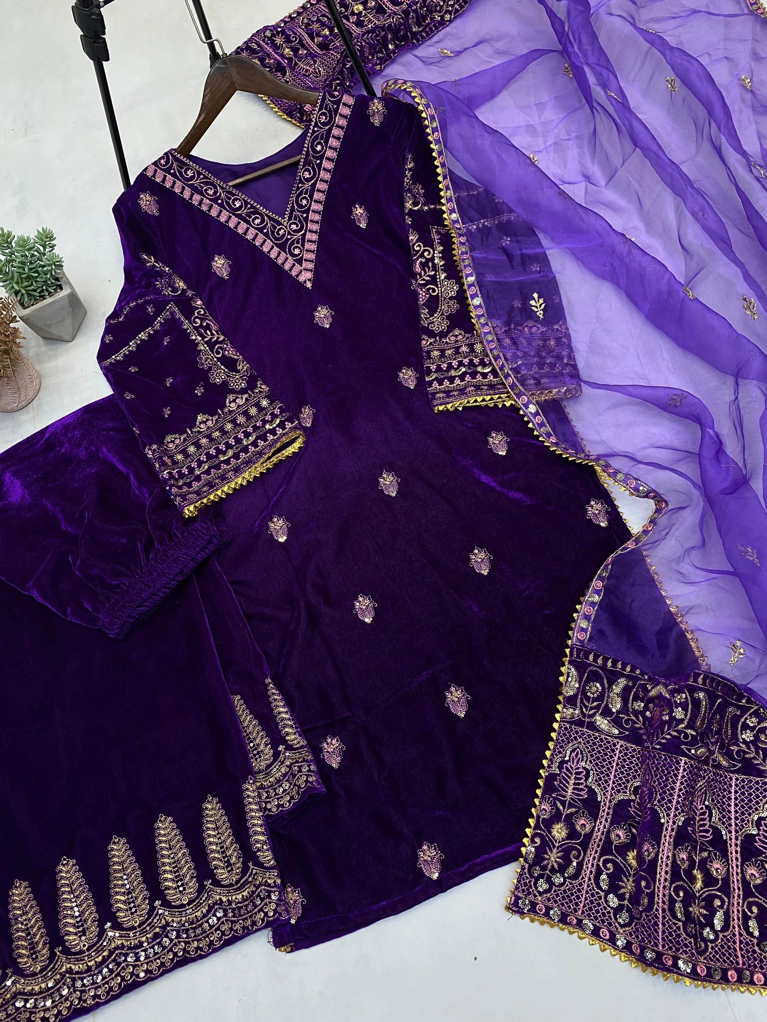 ADORABLE HEAVY VELVET SEQUENCE EMBROIDERY WORK SUIT WITH PLAZO AND DUPATTA