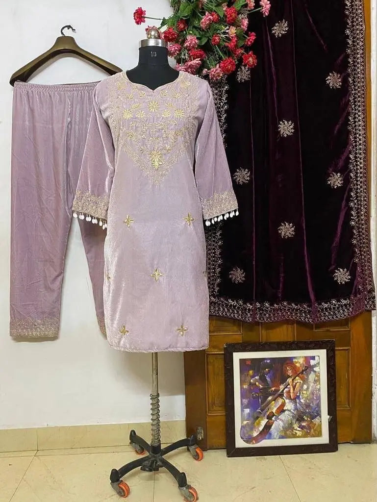 Thread Embroidery work Winter Velvet Suit (Stitched)