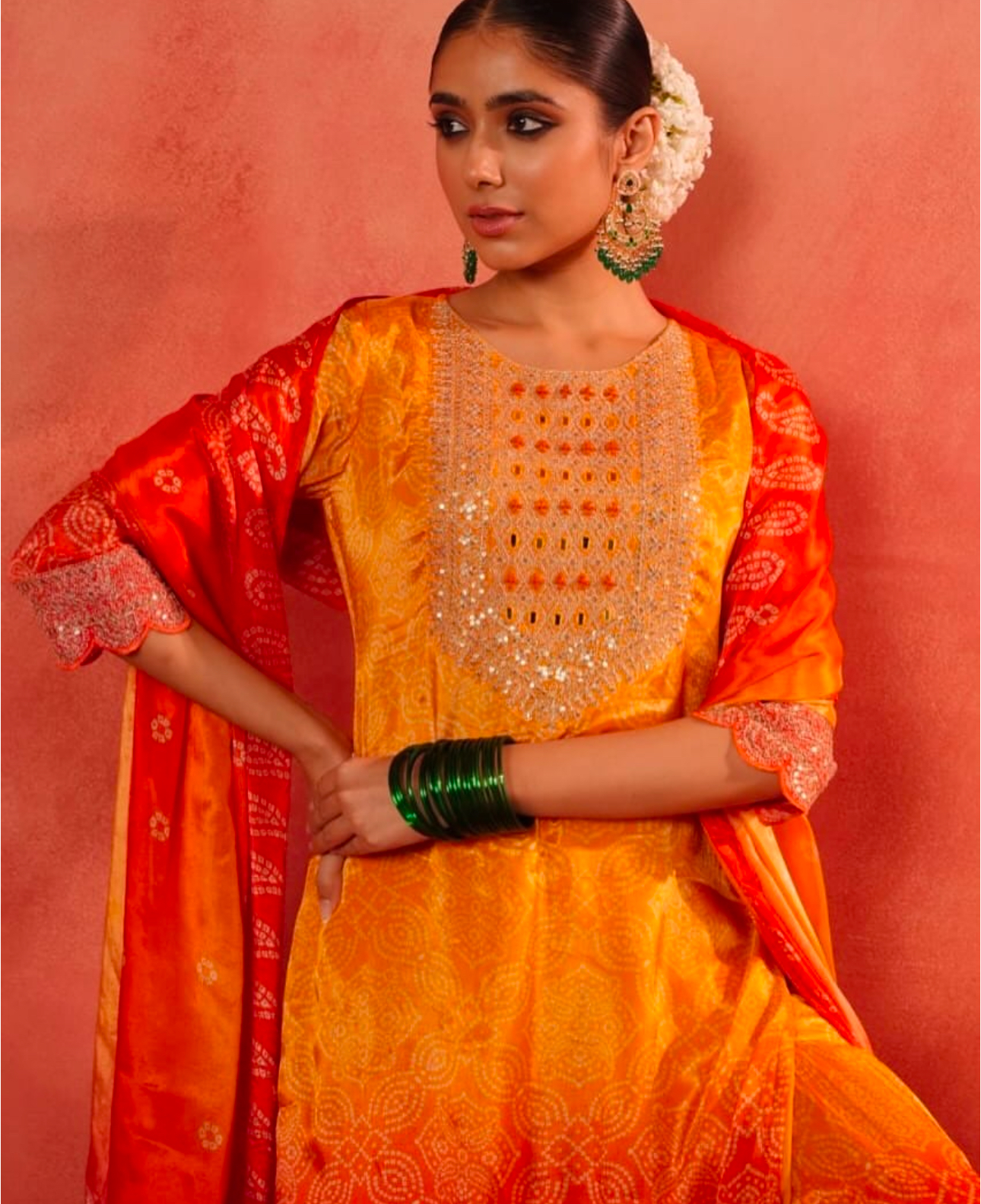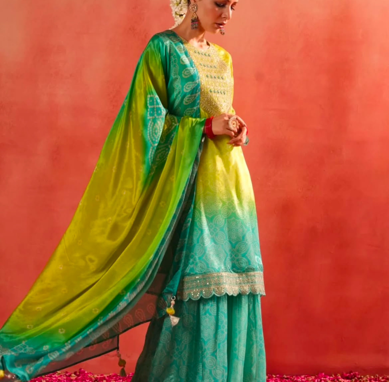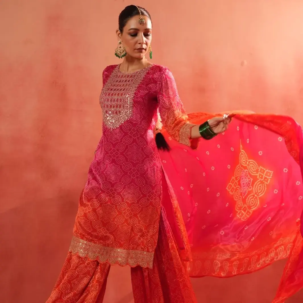 Traditional Bandhani Sharara Set for Women – Mirror Neck Kurta with Dupatta – Perfect for Haldi/Mehendi/Navratri/Wedding
